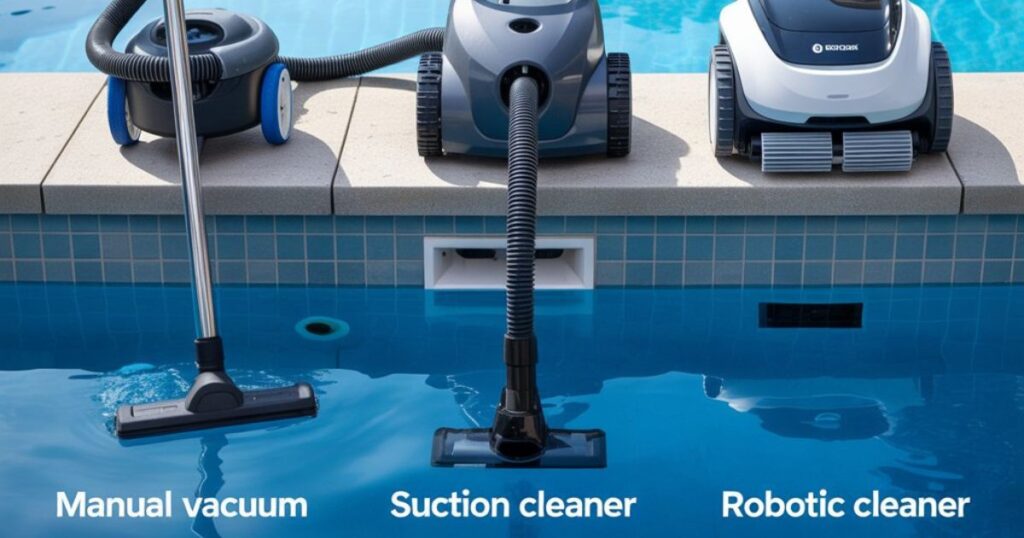 Pool vacuums differ based on automation level and cleaning power. Manual systems provide detailed manual pool vacuuming, allowing owners to target corners and heavy debris zones directly. Suction cleaners connect to filtration systems and perform basic swimming pool cleaning automatically during circulation cycles.